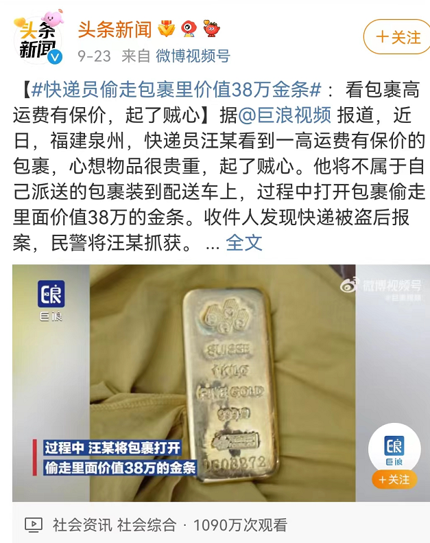 快递员偷走1000克金条价值38万元!