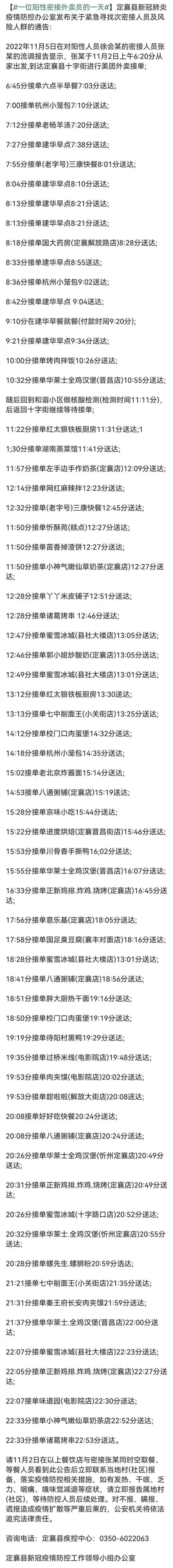 就在同一天,定襄县新冠疫情防控办公室发布了一份通告,一位外卖小哥查出了“阳性”。而他这一天的行动轨迹令人唏嘘不已。从早上6:20出门开始工作,到晚上23:00停止接单,一天只吃了一顿早饭。在刘主任因为缺席女儿生日而落泪的时候,有人却仅靠这一顿早饭扛过了一天。